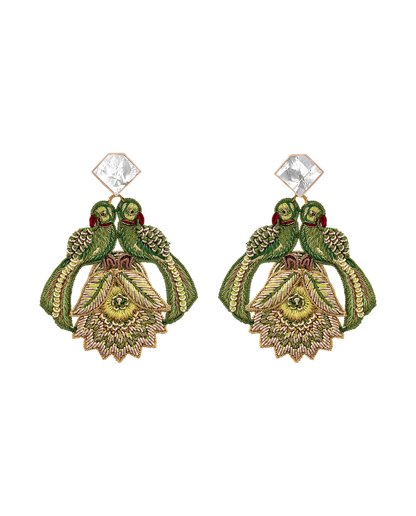 Grace and charm unite in these earrings, featuring two birds in soft green shades, hand-embroidered for nature-inspired elegance. Perfect for pairing with your summer outfits, these earrings add a playful and fresh touch.