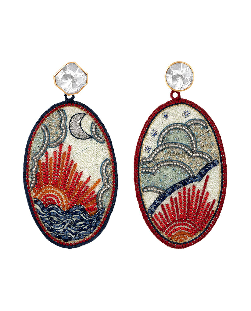 Gracefully crafted, these mix-matched earrings showcase a blend of sunset and sunrise designs, with one featuring a blue border and the other framed in red. Hand-embroidered for a sophisticated touch of color and artistry.